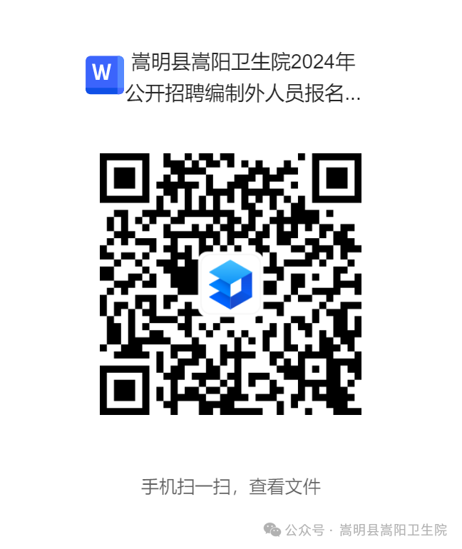報名方式:采取線上報名的方式,意向報名考生掃描下方二維碼,同時下載附件1:《嵩明縣嵩陽衛(wèi)生院2024年公開招聘編制外人員報名表,填寫完整后上傳至報名窗口,聯(lián)系電話:0871-67923000