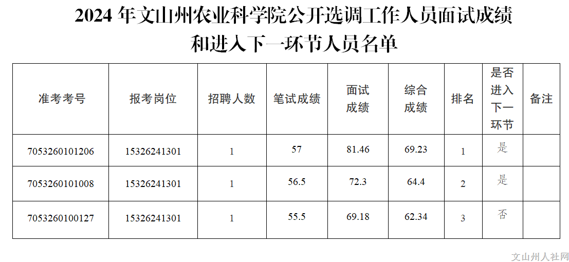 根據(jù)《2024年文山州州屬事業(yè)單位公開(kāi)選調(diào)工作人員通告》《2024年文山州州屬事業(yè)單位公開(kāi)選調(diào)工作人員筆試成績(jī)通告》和《文山州農(nóng)業(yè)科學(xué)院2024年公開(kāi)選調(diào)工作人員面試通告》規(guī)定的程序和要求,文山州農(nóng)業(yè)科學(xué)院于2024年8月3日組織了面試,現(xiàn)將面試成績(jī)和后續(xù)有關(guān)事項(xiàng)通告如下。