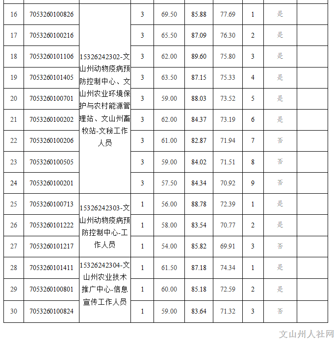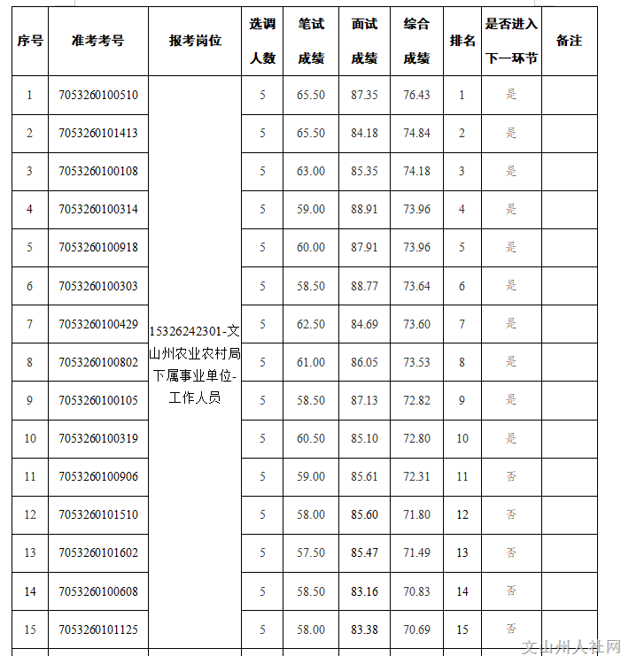 附件:2024年文山州農(nóng)業(yè)農(nóng)村局直屬事業(yè)單位公開選調(diào)工作人員面試成績(jī)和進(jìn)入下一環(huán)節(jié)人員名單