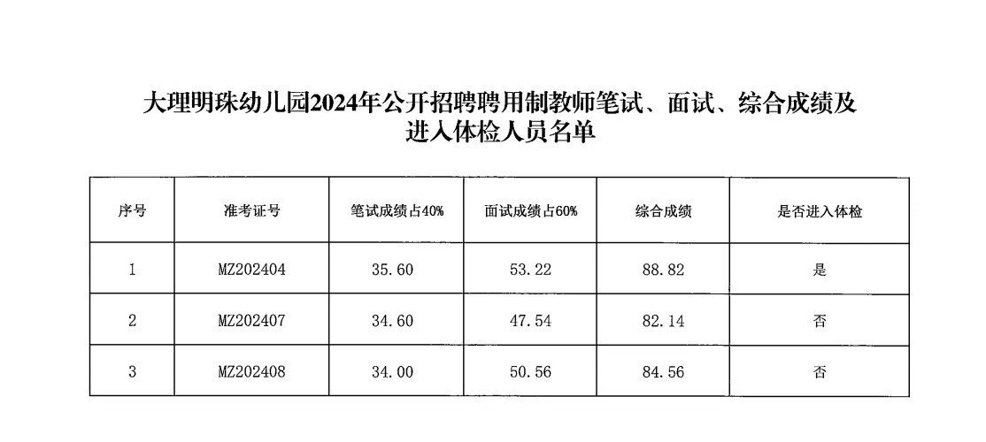 附件:大理明珠幼兒園2024年公開招聘聘用制教師筆試、面試、綜合成績(jī)及進(jìn)入體檢人員名單
