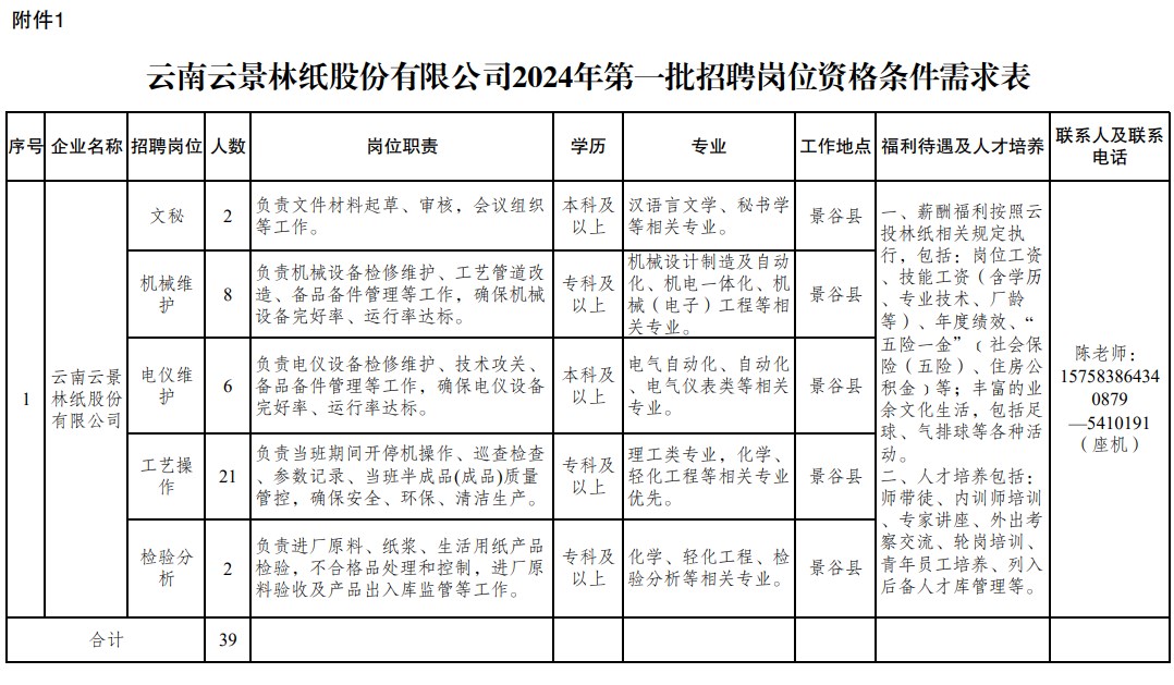 招聘崗位詳見附件1《云南云景林紙股份有限公司2024年第一批招聘崗位資格條件需求表》。