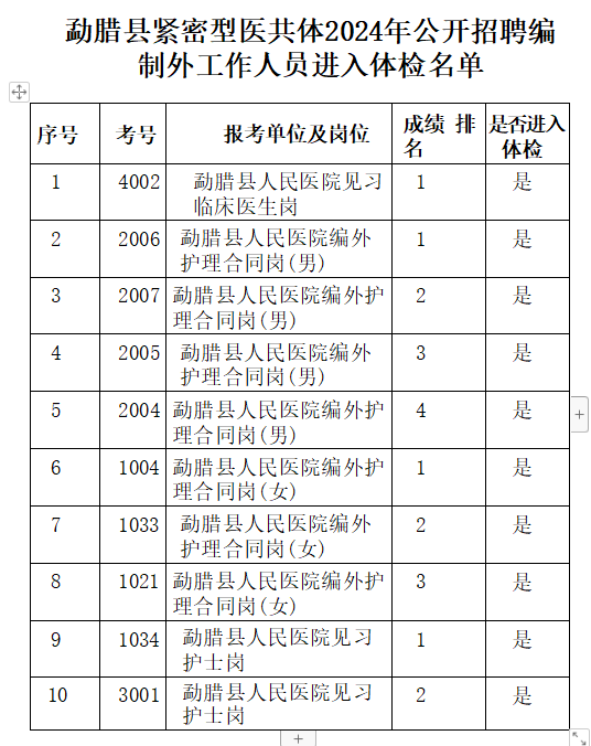 勐臘縣緊密型醫(yī)共體2024年公開招聘編制外工作人員進(jìn)入體檢人員名單公示