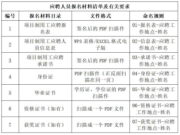 應(yīng)聘人員按照應(yīng)聘人員報(bào)名材料清單及有關(guān)要求提供報(bào)名材料,將《項(xiàng)目制用工應(yīng)聘報(bào)名表》(附件1)、《項(xiàng)目制用工應(yīng)聘人員信息表》(附件2)、《項(xiàng)目制用工應(yīng)聘人員承諾書》(附件3)及相關(guān)報(bào)名材料以壓縮包形式發(fā)送至電子郵箱:250543271@qq.com。本次招聘僅接受電子郵件方式報(bào)名,應(yīng)聘材料一經(jīng)提交,不能修改,請務(wù)必慎重填報(bào)。