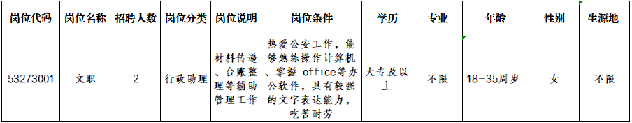 本次招錄共設(shè)1個(gè)崗位,女性2人。詳情請(qǐng)關(guān)注“西盟警方”微信公眾號(hào)查詢(xún)。