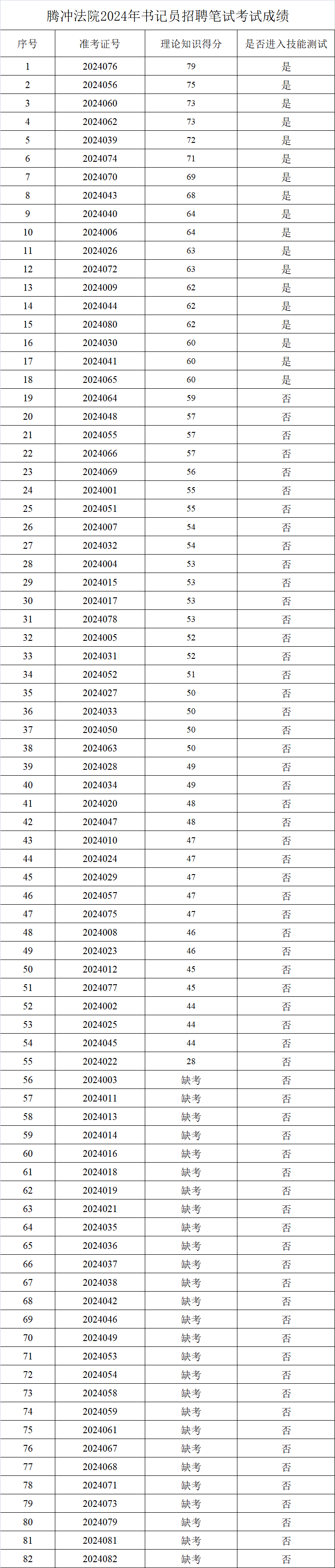 騰沖市人民法院2024年公開招聘聘用制書記員筆試工作已圓滿結(jié)束,根據(jù)《騰沖市人民法院2024年公開招聘聘用制書記員公告》的相關(guān)要求,現(xiàn)將筆試成績有關(guān)事項公示如下: