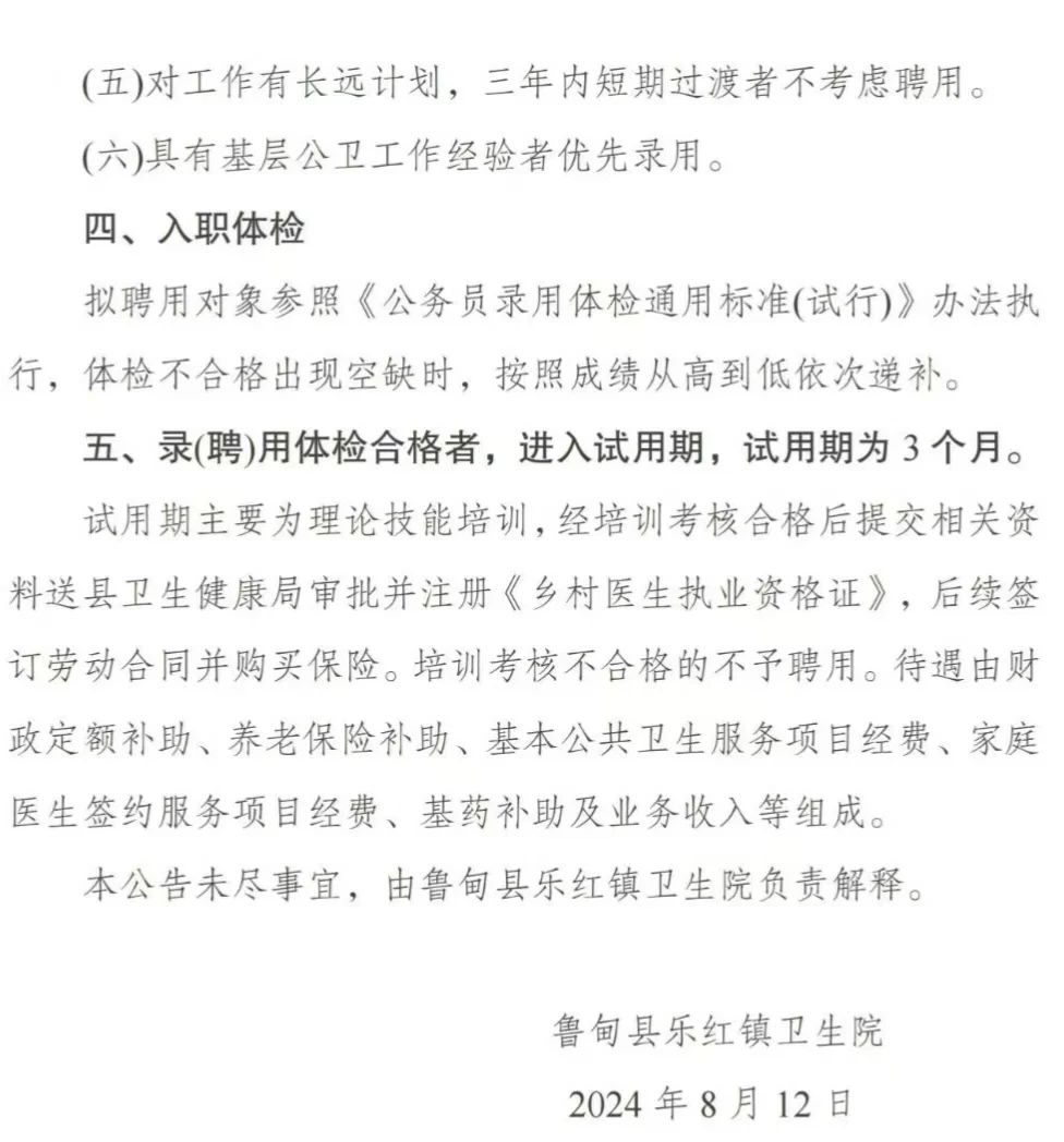 2024年昭通市魯?shù)榭h樂紅鎮(zhèn)衛(wèi)生院招聘鄉(xiāng)村醫(yī)生公告