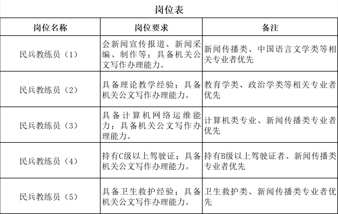 根據(jù)有關(guān)規(guī)定和工作需要,澄江市人民武裝部擬招聘民兵教練員5名?,F(xiàn)將有關(guān)事項公告如下: