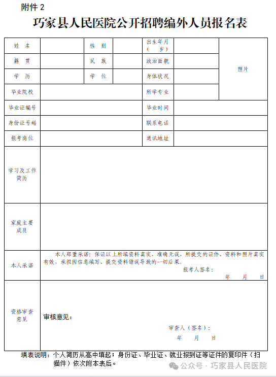2、巧家縣人民醫(yī)院公開招聘編外人員報(bào)名表