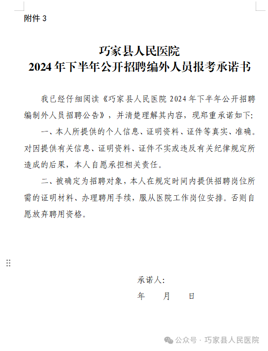 3、巧家縣人民醫(yī)院2024年下半年公開招聘編外人員報(bào)考承諾書