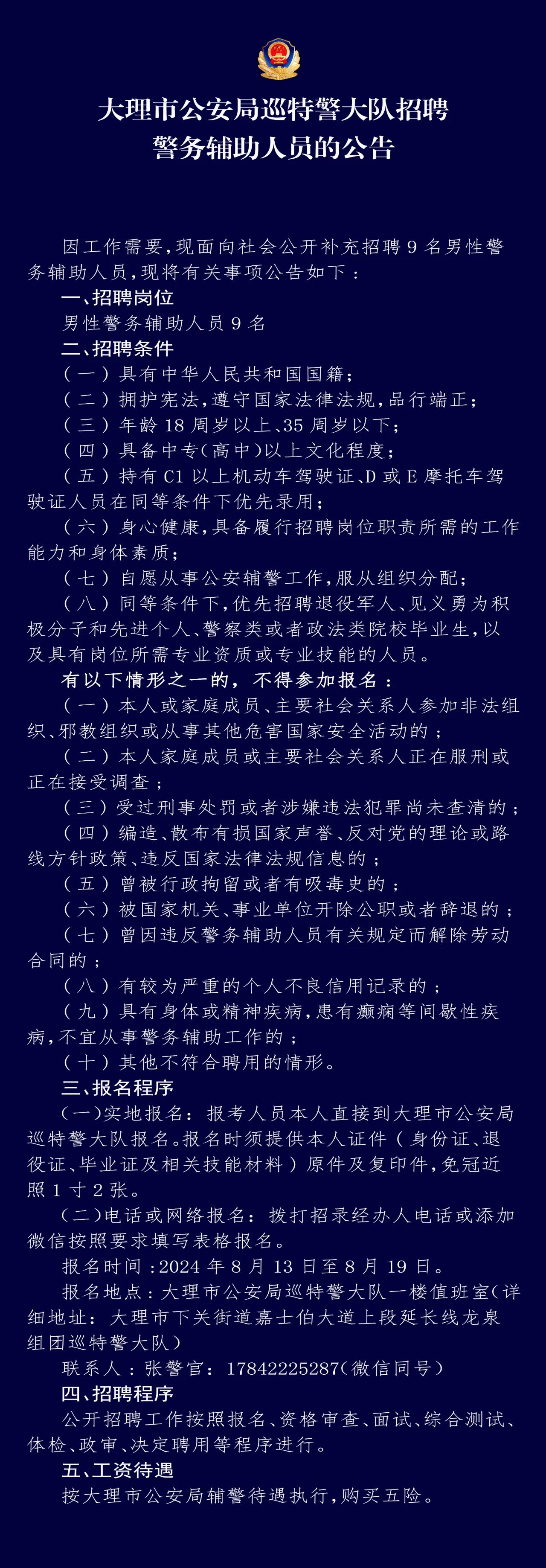 大理市公安局巡特警大隊(duì)招聘警務(wù)輔助人員的公告
