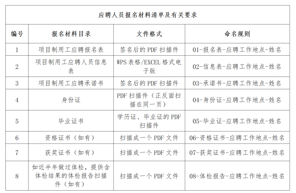 應(yīng)聘人員按照應(yīng)聘人員報(bào)名材料清單及有關(guān)要求提供報(bào)名材料將《項(xiàng)目制用工應(yīng)聘報(bào)名表》(附件1)、《項(xiàng)目制用工應(yīng)聘人員信息表》(附件2)、《項(xiàng)目制用工應(yīng)聘人員承諾書》(附件3)及相關(guān)報(bào)名材料以壓縮包形式(郵件主題、壓縮包均統(tǒng)一命名為“應(yīng)聘工作地點(diǎn)-姓名,例如:普洱市瀾滄縣-XXX”)發(fā)送至電子郵箱: 18787231841@163.com。