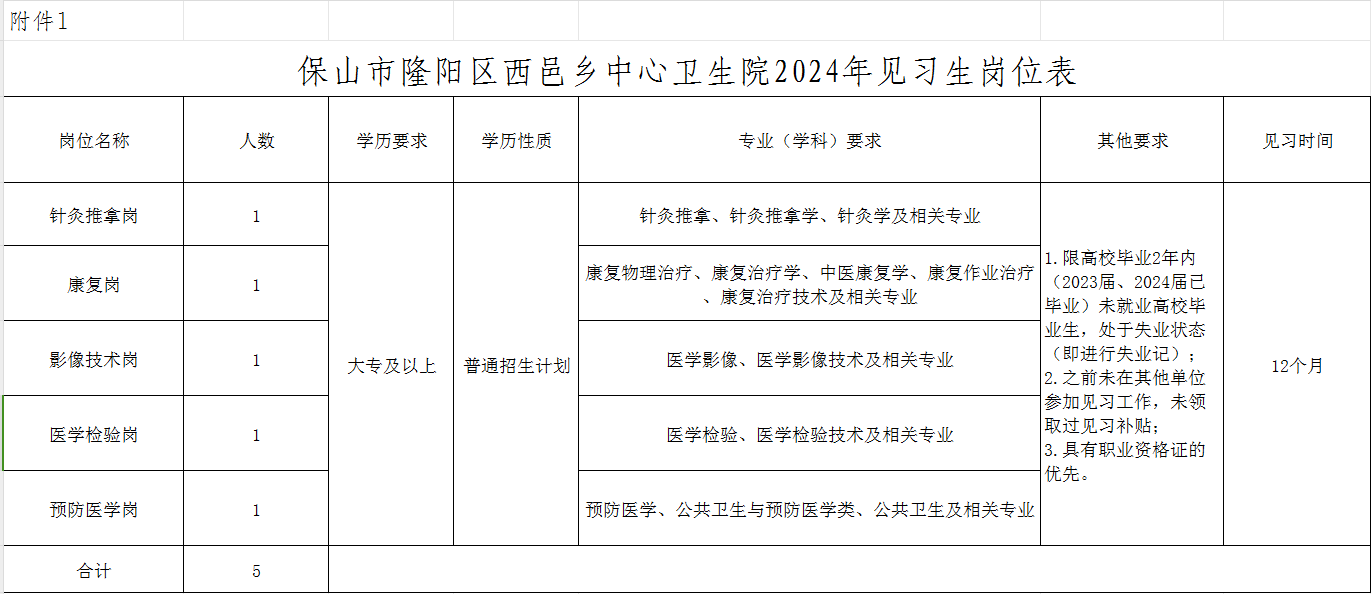 附件1:保山市隆陽(yáng)區(qū)西邑鄉(xiāng)中心衛(wèi)生院2024年見(jiàn)習(xí)生崗位表.xlsx