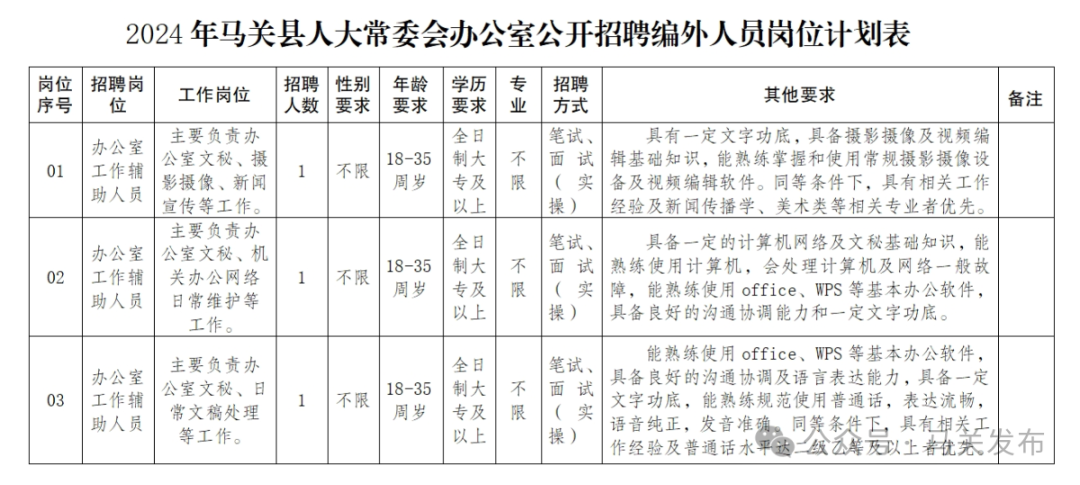 2.具體崗位要求條件詳見《馬關(guān)縣人大常委會辦公室2024年面向社會公開招聘編外人員崗位計劃表》(附件1)。