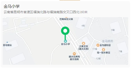官渡區(qū)金馬小學(xué)建于公元1911年,是一所有著百年建校歷史的全日制公辦小學(xué),2023年搬遷到新校區(qū),位于官渡區(qū)金馬街道辦事處東驤社區(qū)(近地鐵3號(hào)線金馬寺站)?,F(xiàn)學(xué)校共有三個(gè)校區(qū),分別是明玥半山校區(qū)、黑土凹校區(qū)、金馬寺校區(qū)。學(xué)校有在校生4022人,80個(gè)教學(xué)班,教職工193人。學(xué)校配備了高標(biāo)準(zhǔn)的科學(xué)實(shí)驗(yàn)室、圖書室、書法室、音樂室、美術(shù)室、勞動(dòng)教室、心里咨詢室、信息教室、舞蹈室、創(chuàng)客空間、體育器械室、室內(nèi)體育場(chǎng)館等,為學(xué)生全面發(fā)展提供了無限可能。同時(shí),學(xué)校還將在辦學(xué)特色上進(jìn)一步挖掘、對(duì)校園文化、實(shí)踐基地、書育空間、藝術(shù)審美等場(chǎng)景美學(xué)進(jìn)行高度統(tǒng)整,盡快實(shí)現(xiàn)學(xué)校特色、內(nèi)涵發(fā)展。