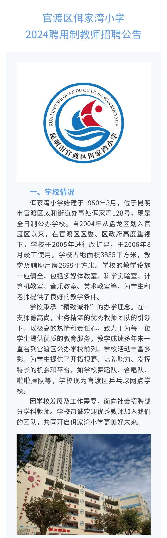 2024年昆明市官渡區(qū)佴家灣小學(xué)聘用制教師招聘公告