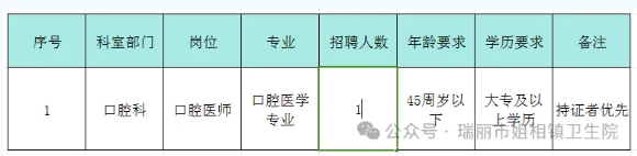 瑞麗市姐相鎮(zhèn)衛(wèi)生院口腔科醫(yī)師招聘公告