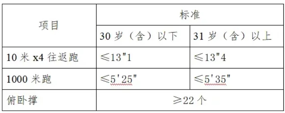 體能測試項(xiàng)目包括:1000米跑、4x10米往返跑,俯臥撐,兩項(xiàng)以上測試達(dá)標(biāo)視為體能合格。