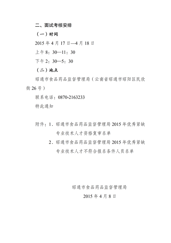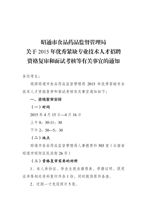 昭通市食品藥品監(jiān)督管理局2015年招聘資格復(fù)審等有關(guān)事宜通知