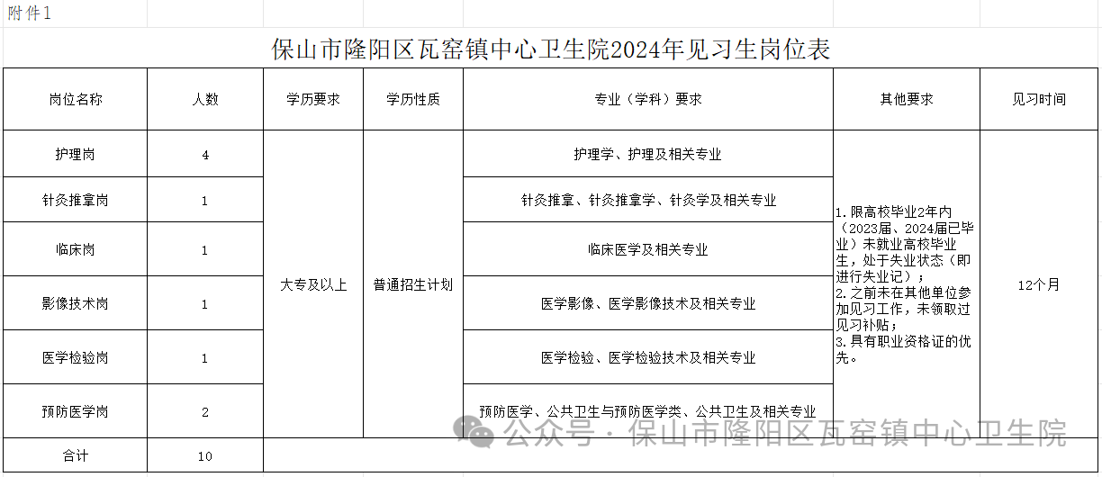 附件1:隆陽區(qū)瓦窯鎮(zhèn)中心衛(wèi)生院2024年見習(xí)生崗位表.xlsx