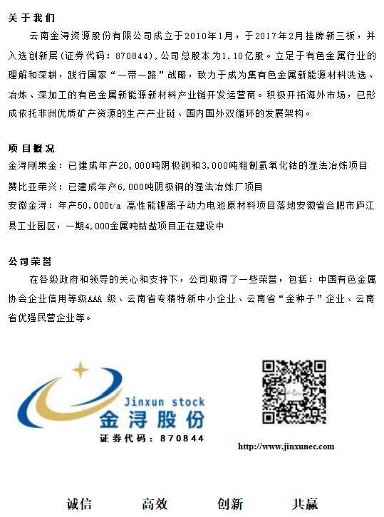云南金潯資源股份有限公司成立于2010年1月,位于云南省昆明市高新區(qū)昌源北路1389號B幢三樓。注冊資本11029.6643萬元,是集有色金屬新能源材料選礦、冶煉、深加工及資源綜合循環(huán)利用為一體的全產(chǎn)業(yè)鏈運營商。公司于2017年2月掛牌新三板,證券簡稱:金潯股份,證券代碼:870844。公司發(fā)展始終與國家戰(zhàn)略同頻共振,積極響應(yīng)“一帶一路”倡議,踐行國家“走出去”戰(zhàn)略,順應(yīng)國家構(gòu)建國內(nèi)國際雙循環(huán)相互促進的新發(fā)展格局號召,積極推動全球化戰(zhàn)略。
