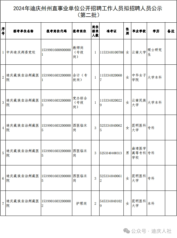 2024年迪慶州州直事業(yè)單位公開招聘擬招聘人員名單公示(第二批)