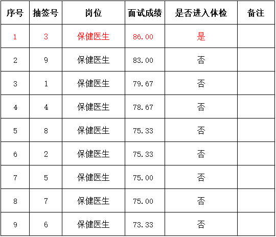 (一)保健醫(yī)生招聘1人,報考9人,實到9人,公示如下: