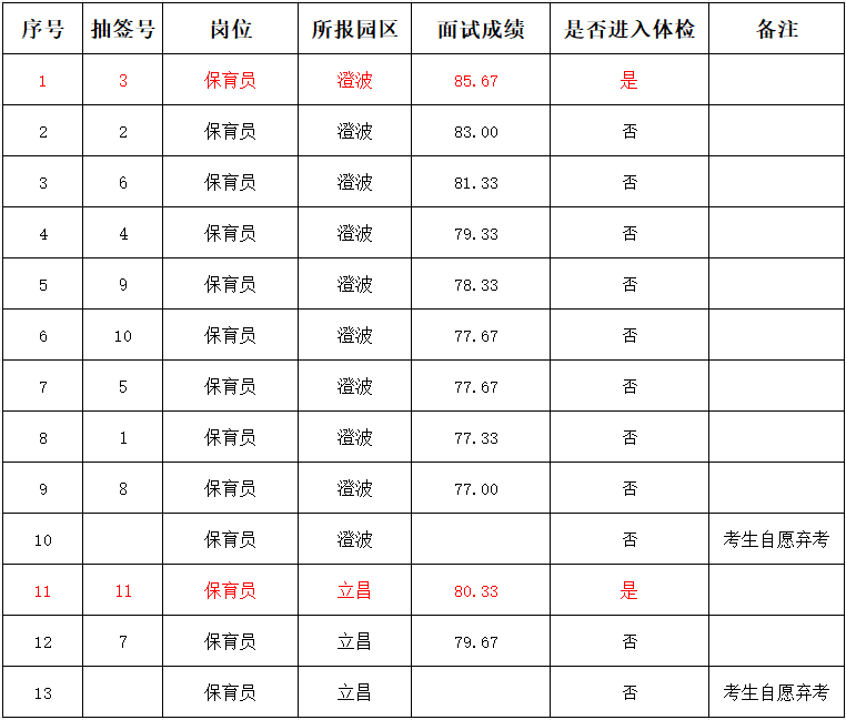 (二)保育員招聘2人,其中澄波園區(qū)1人,立昌園區(qū)1人。報考13人(澄波園區(qū)10人,立昌3人),面試過程中2名考生自愿棄考,11人參加面試,公示如下: