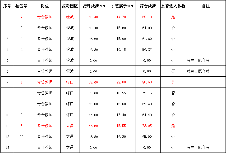 (四)專任教師招聘3人,分別是澄波園區(qū)1人,立昌園區(qū)1人,??谥行挠變簣@1人,報考13人,其中3人自愿棄考,公示如下: