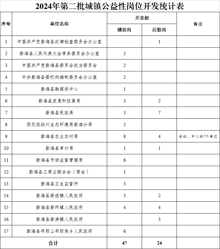 招聘崗位71個。具體招聘崗位數(shù)量詳見《勐??h2024年第二批城鎮(zhèn)公益性崗位開發(fā)統(tǒng)計(jì)表》。