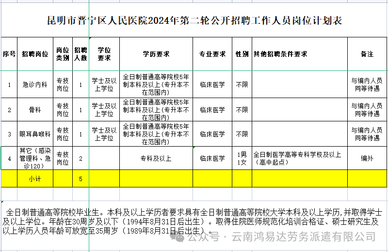 詳見《昆明市晉寧區(qū)人民醫(yī)院2024年第二輪公開招聘工作人員崗位計劃表》。