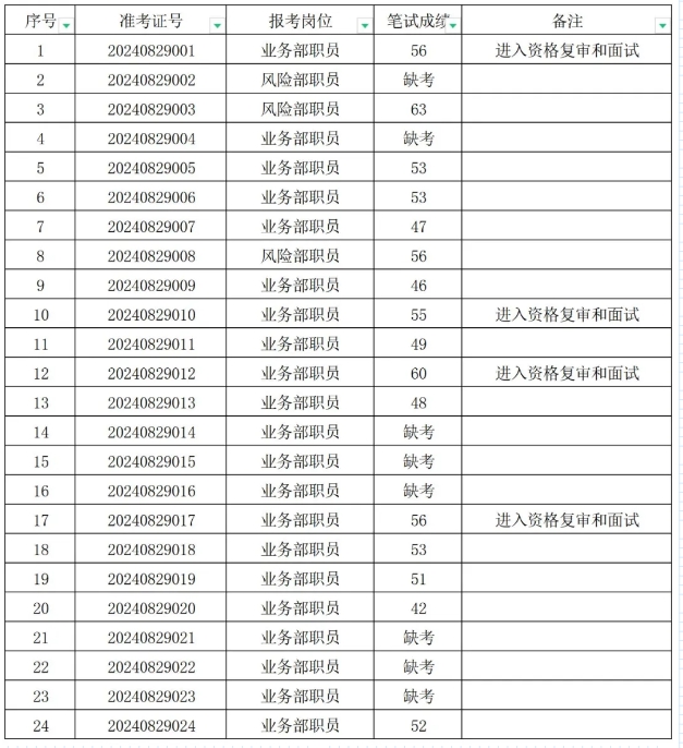 大理州創(chuàng)新融資擔(dān)保有限公司招聘工作人員筆試已于2024年8月29日下午結(jié)束,根據(jù)招聘安排,現(xiàn)將筆試成績(jī)公告如下,請(qǐng)進(jìn)入下一環(huán)節(jié)考生保持通訊暢通。