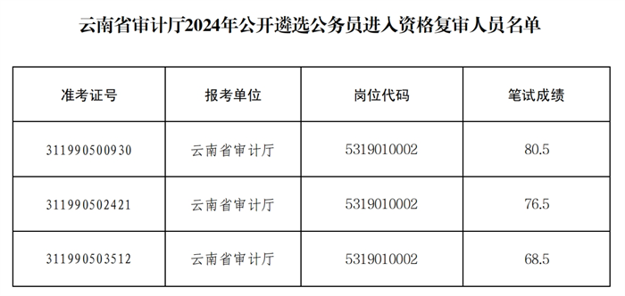 報(bào)考云南省審計(jì)廳的報(bào)考人員,按照筆試成績(jī)從高到低的順序,以與遴選職位數(shù)3:1的比例確定資格復(fù)審人員。名單詳見(jiàn)附件。