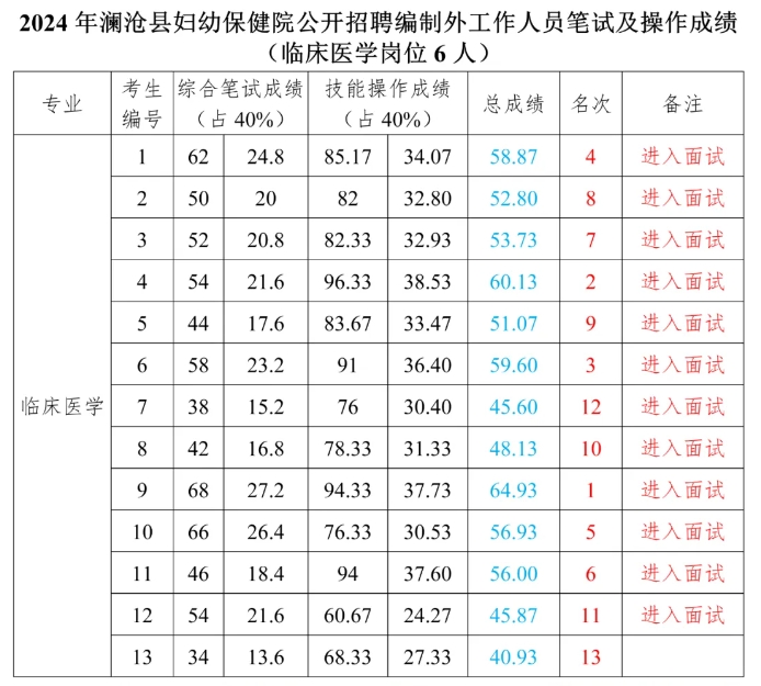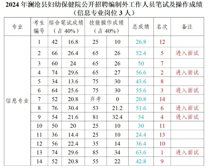 根據(jù)《瀾滄縣緊密型醫(yī)共體成員單位(婦幼保健院)2024年第三批人才招聘公告》,9月9日,瀾滄縣婦幼保健院在1號(hào)樓六樓進(jìn)行了人才招聘綜合筆試、技能操作考試,現(xiàn)將2024年瀾滄縣婦幼保健院第三批公開招聘編制外工作人員成績(jī)公示如下: