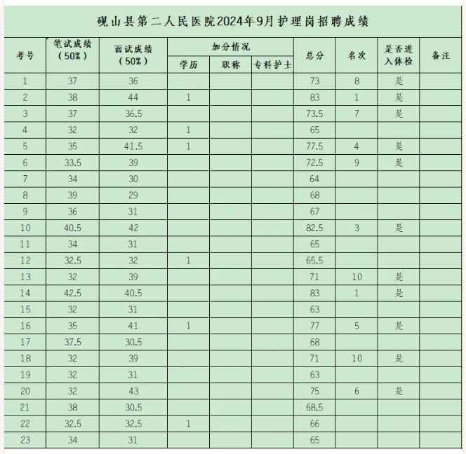 硯山縣第二人民醫(yī)院2024年9月招聘編外護理崗成績公示如下: