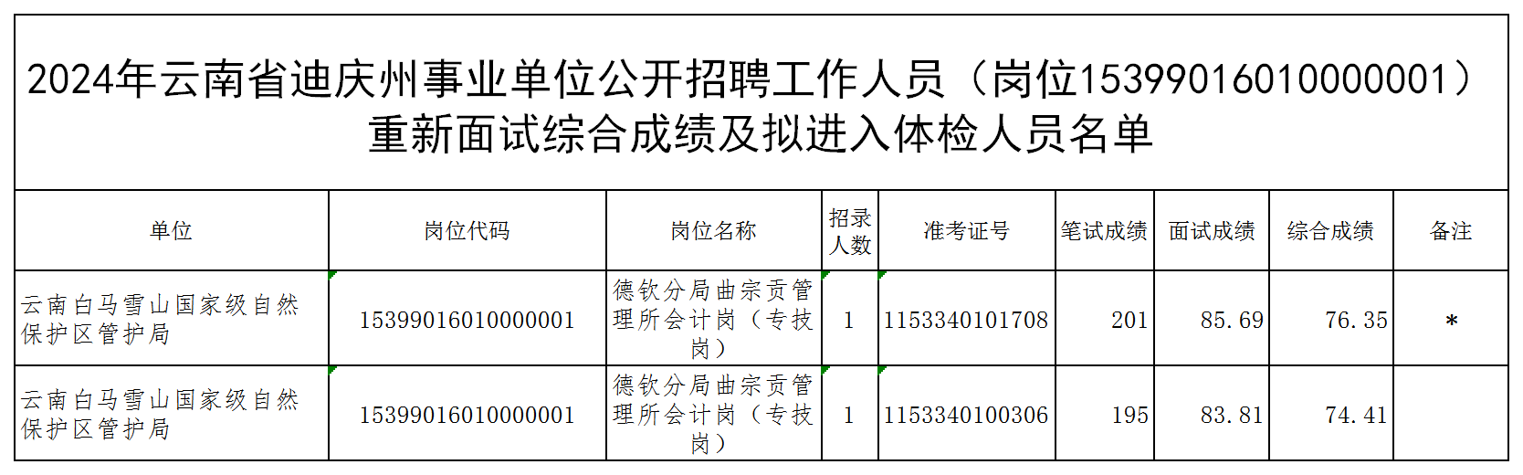 按照事業(yè)單位公開招聘有關(guān)流程,現(xiàn)將2024年云南省迪慶州事業(yè)單位公開招聘工作人員(崗位15399016010000001)重新面試綜合成績及擬進(jìn)入體檢人員名單進(jìn)行公布,并將有關(guān)事項通知如下: