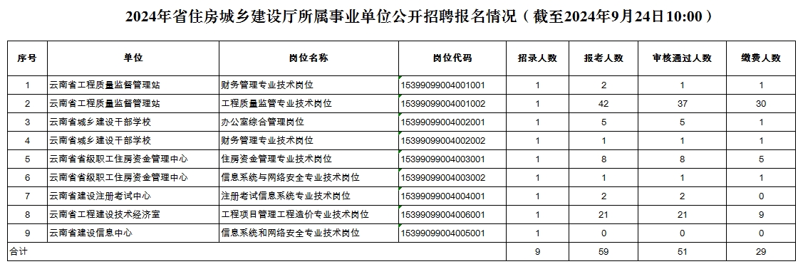 附件:2024年云南省住房和城鄉(xiāng)建設(shè)廳所屬事業(yè)單位公開招聘報(bào)名情況(截至9月24日10:00)