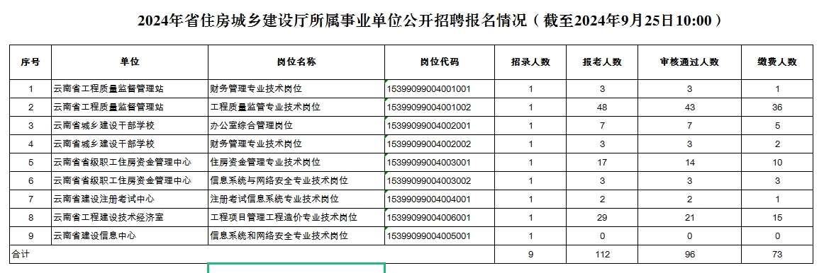 附件:2024年云南省住房和城鄉(xiāng)建設(shè)廳所屬事業(yè)單位公開(kāi)招聘報(bào)名情況(截至9月25日10:00)