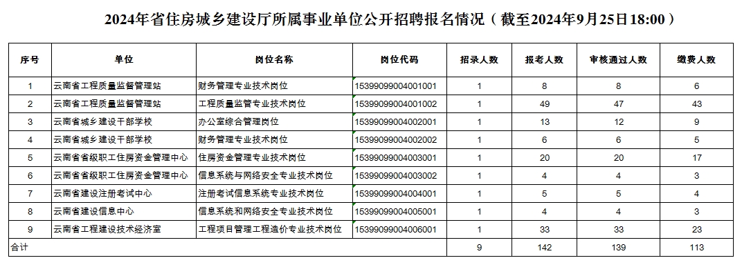 附件:2024年云南省住房和城鄉(xiāng)建設(shè)廳所屬事業(yè)單位公開招聘報名情況(截至9月25日18:00)