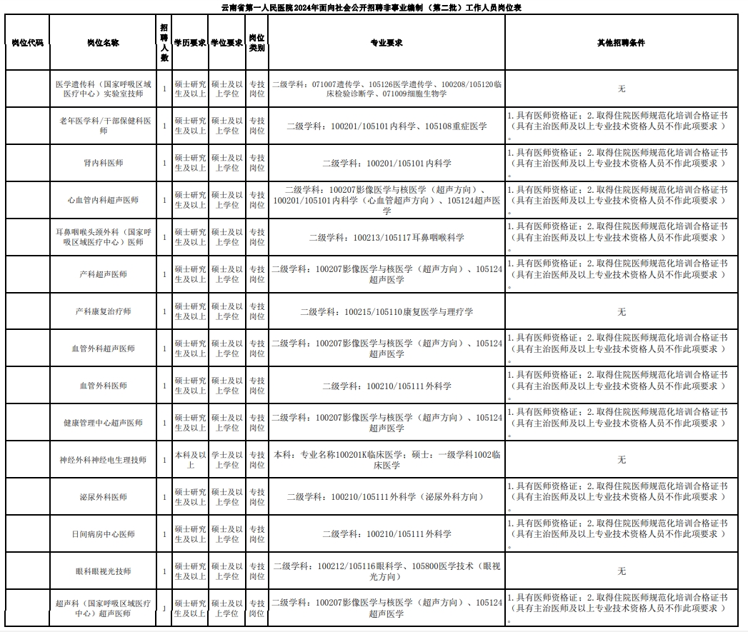 附件1-云南省第一人民醫(yī)院2024年面向社會公開招聘非事業(yè)編制(第二批工作人員崗位表.pdf