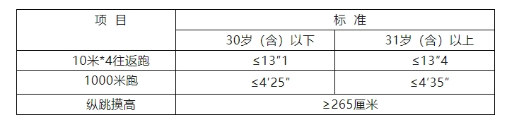體能測試內(nèi)容及標準參照《公安機關錄用人民警察體能測評項目和標準(暫行)》(人社部發(fā)〔2011〕48號)執(zhí)行。