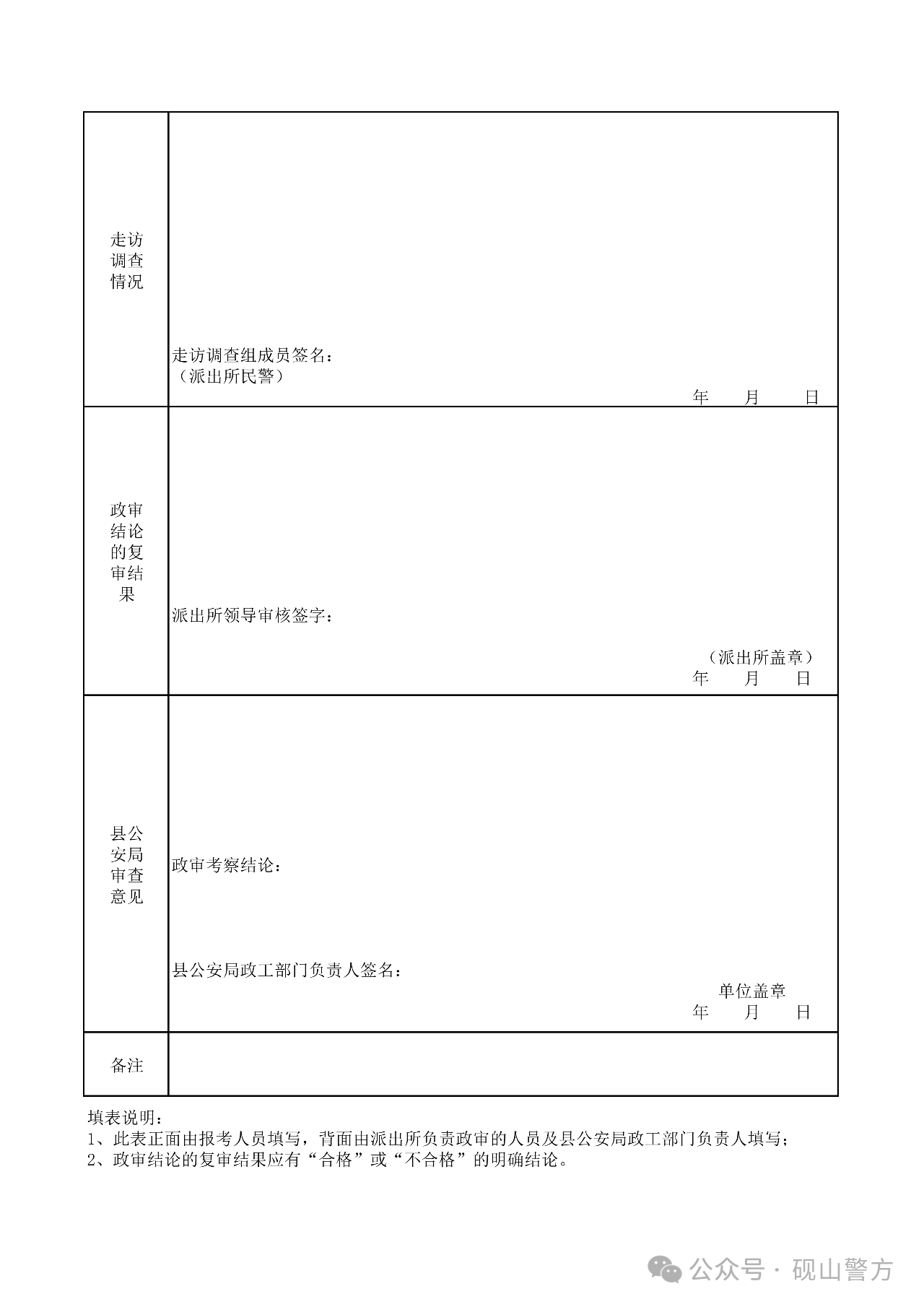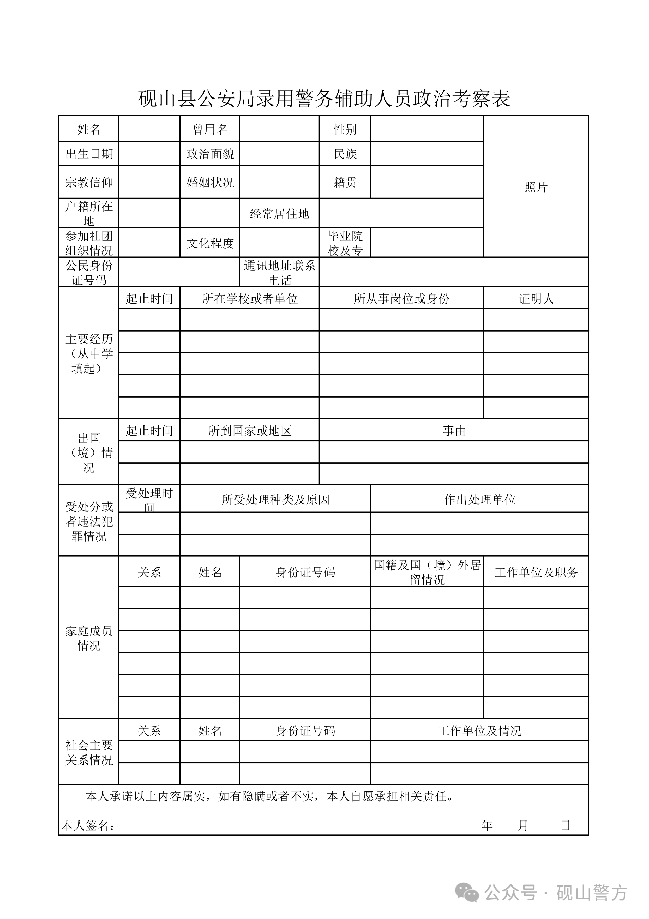 (4)真實完整填寫好《硯山縣公安局錄用警務輔助人員政治考察表》,并在戶籍地派出所蓋章、戶籍地派出所所屬縣公安局政工部門蓋章。