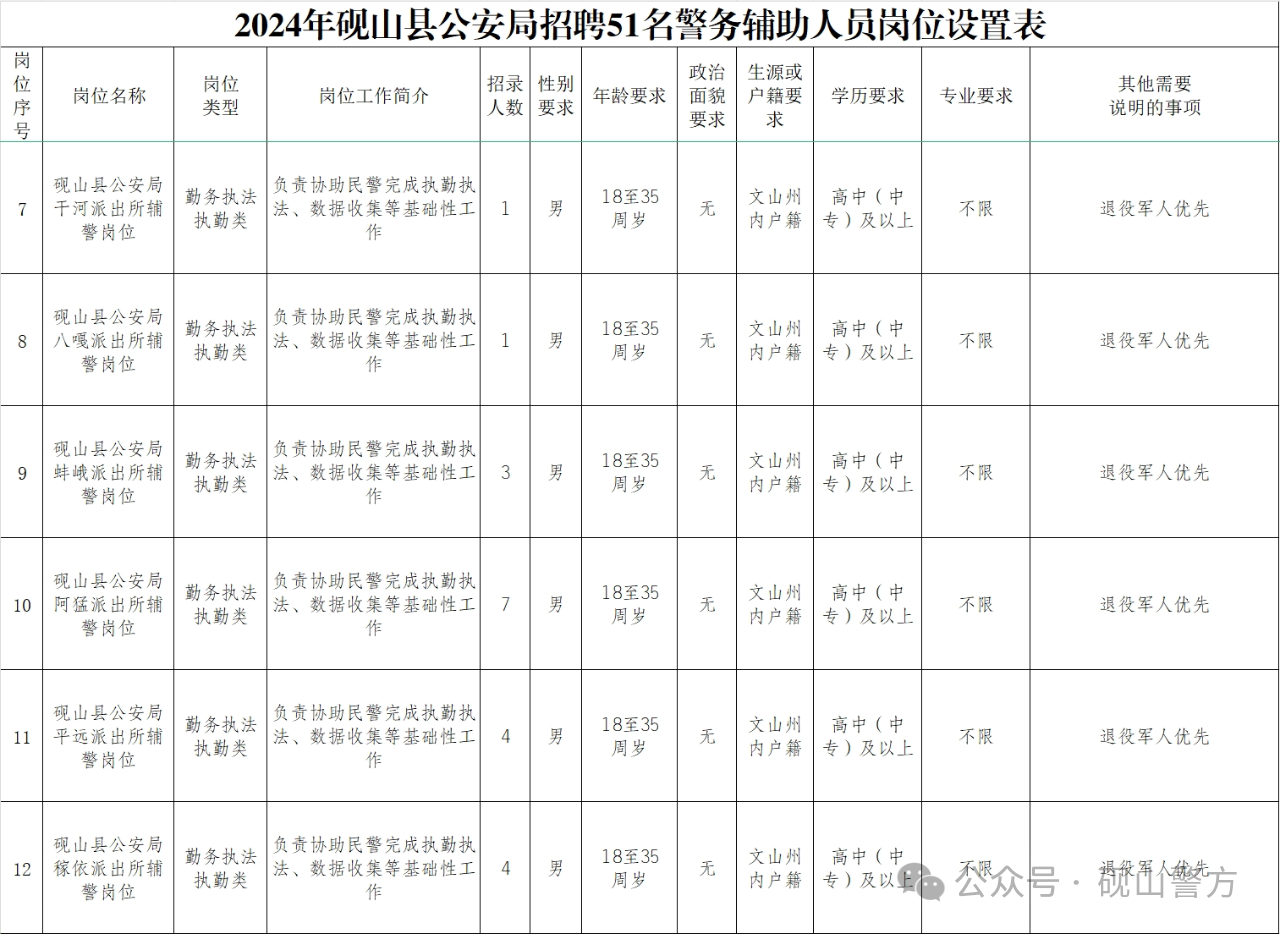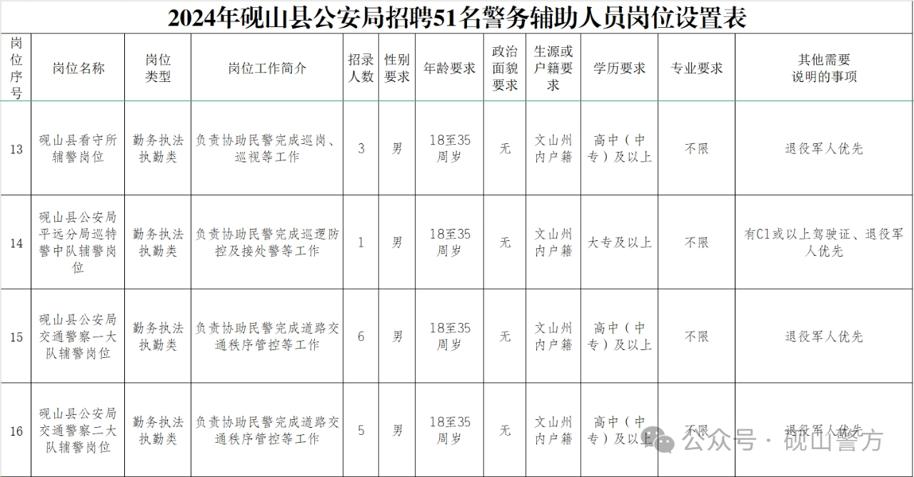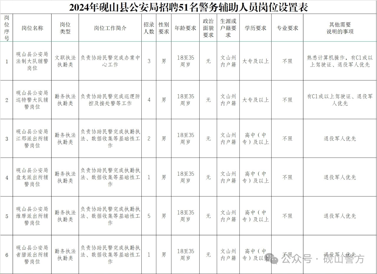 硯山縣公安局此次面向社會公開招聘輔警51名。招聘崗位及人數(shù)詳見《硯山縣公安局招聘警務輔助人員崗位設置表》。