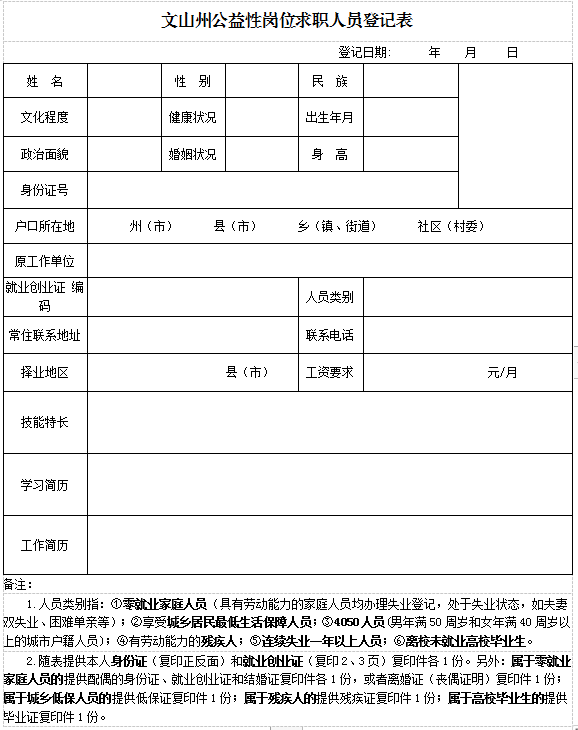 報名時應(yīng)提交的材料:公益性崗位求職人員登記表、本人身份證及復印件、就業(yè)失業(yè)登記(就業(yè)創(chuàng)業(yè)證)原件及復印件、學歷證書及復印件。