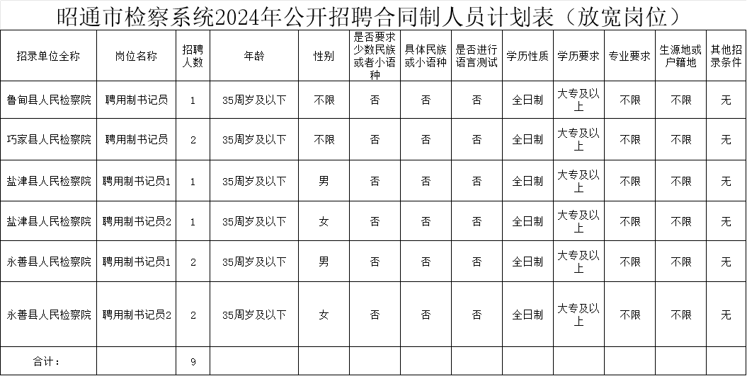魯?shù)榭h人民檢察院聘用制書記員崗位擬招聘1人、巧家縣人民檢察院聘用制書記員崗位擬招聘2人、鹽津縣人民檢察院聘用制書記員1(限男)擬招聘1人、鹽津縣人民檢察院聘用制書記員2(限女)擬招聘1人、永善縣人民檢察院聘用制書記員崗位1(限男)擬招聘2人、永善縣人民檢察院聘用制書記員崗位2(限女)擬招聘2人,以上崗位設(shè)置專業(yè)要求放寬為專業(yè)要求不限,詳細(xì)請查看文章末端附件1。