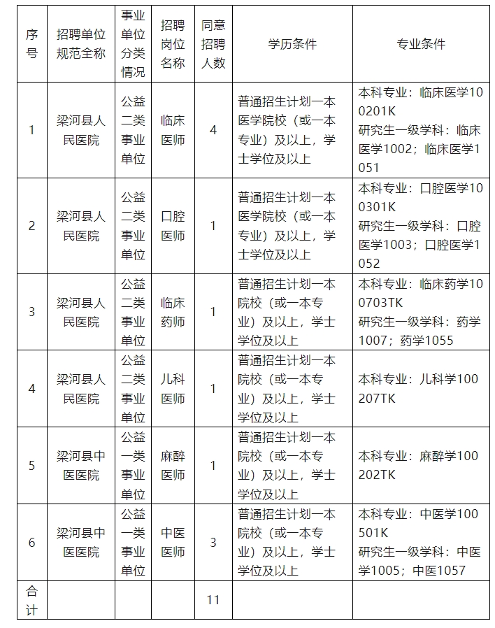 根據(jù)《德宏州人力資源和社會(huì)保障局關(guān)于印發(fā)2025年教育衛(wèi)生部門考核招聘緊缺專業(yè)學(xué)科優(yōu)秀人才工作方案的通知》(德人社發(fā)〔2024〕32號(hào))《中共梁河縣委機(jī)構(gòu)編制委員會(huì)辦公室編制使用通知》(梁機(jī)編辦準(zhǔn)〔2024〕8號(hào))文件精神,2025年梁河縣人民醫(yī)院、梁河縣中醫(yī)醫(yī)院考核招聘緊缺專業(yè)學(xué)科優(yōu)秀人才11人,現(xiàn)將招聘有關(guān)事項(xiàng)通知如下: