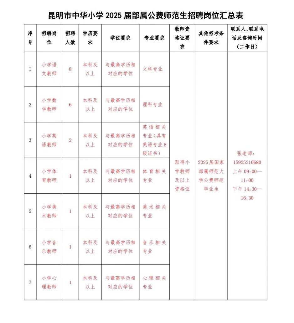 昆明市中華小學(xué)2025屆部屬公費師范生招聘公告