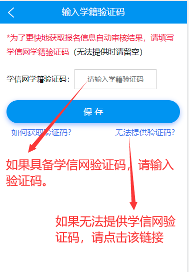 在校生(學信網(wǎng)驗證碼):在校生能提供學信網(wǎng)驗證碼直接輸入驗證碼保存(請注意學信網(wǎng)學籍驗證是否在有效期內),如果在校生確實無法提供學信網(wǎng)驗證碼,點擊下圖提供的“無法提供驗證碼”文字鏈接,之后根據(jù)上傳材料界面提示上傳相應材料即可。