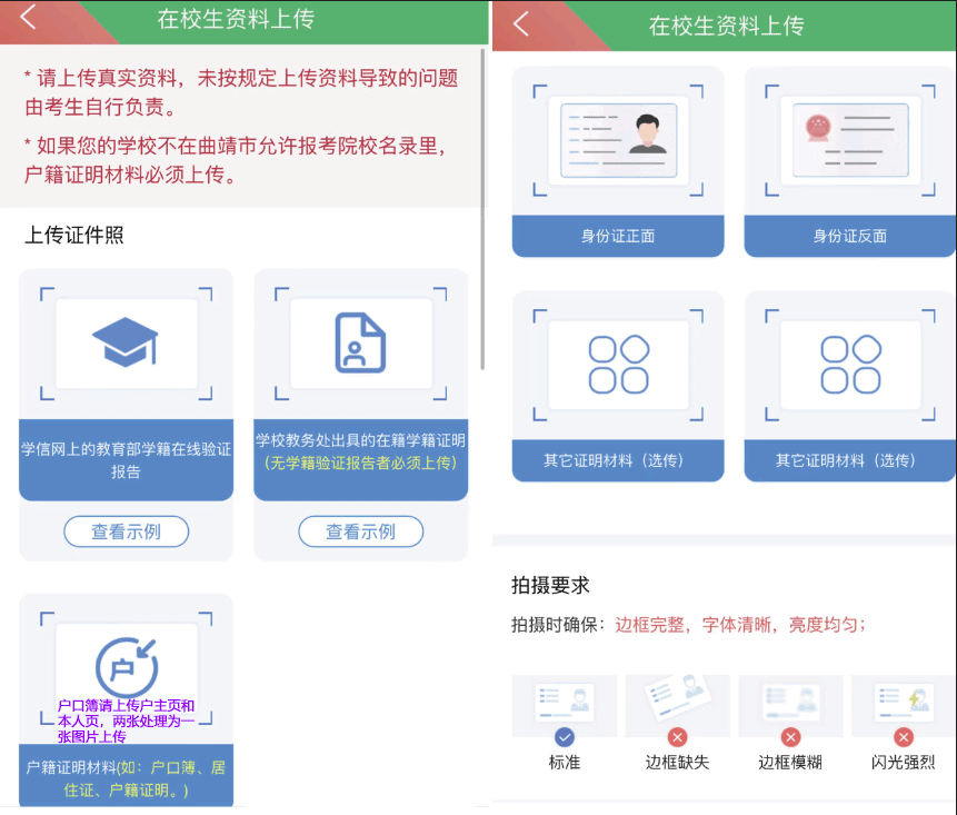 4、上傳資料 進入上傳資料界面,均有上傳對照說明,可對應相應材料圖片上傳。(提示:戶口冊請上傳戶主頁和本人頁,兩張?zhí)幚頌橐粡垐D片上傳)