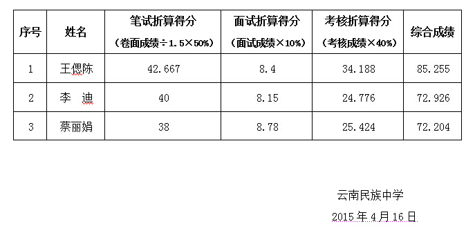 云南民族中學(xué)2015年編外化學(xué)教師招聘綜合成績公示