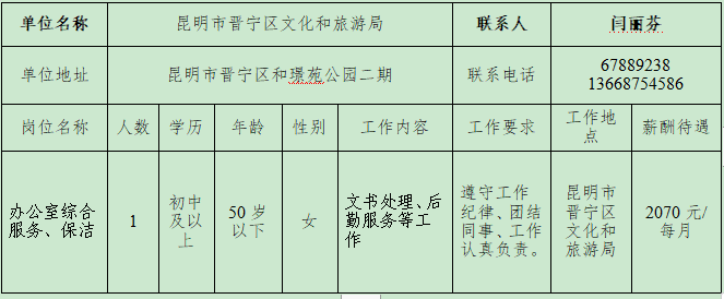根據(jù)《昆明市人力資源和社會保障局昆明市財政局 關(guān)于做好公益性崗位開發(fā)管理有關(guān)工作的通知》(昆人社通〔2020〕37號)精神,按照公開、公平、公正的原則,為做好晉寧區(qū)城鎮(zhèn)公益性崗位開發(fā)管理工作,現(xiàn)將2024年公益性崗位招聘公示如下: